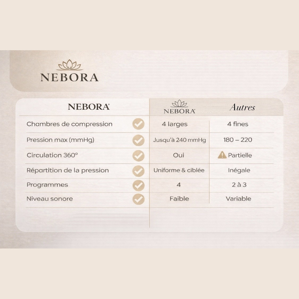 Nebora® utilise une compression pneumatique séquentielle.L’air circule progressivement dans les 4 zones de compression pour stimuler la circulation, favoriser le drainage et détendre les muscles.